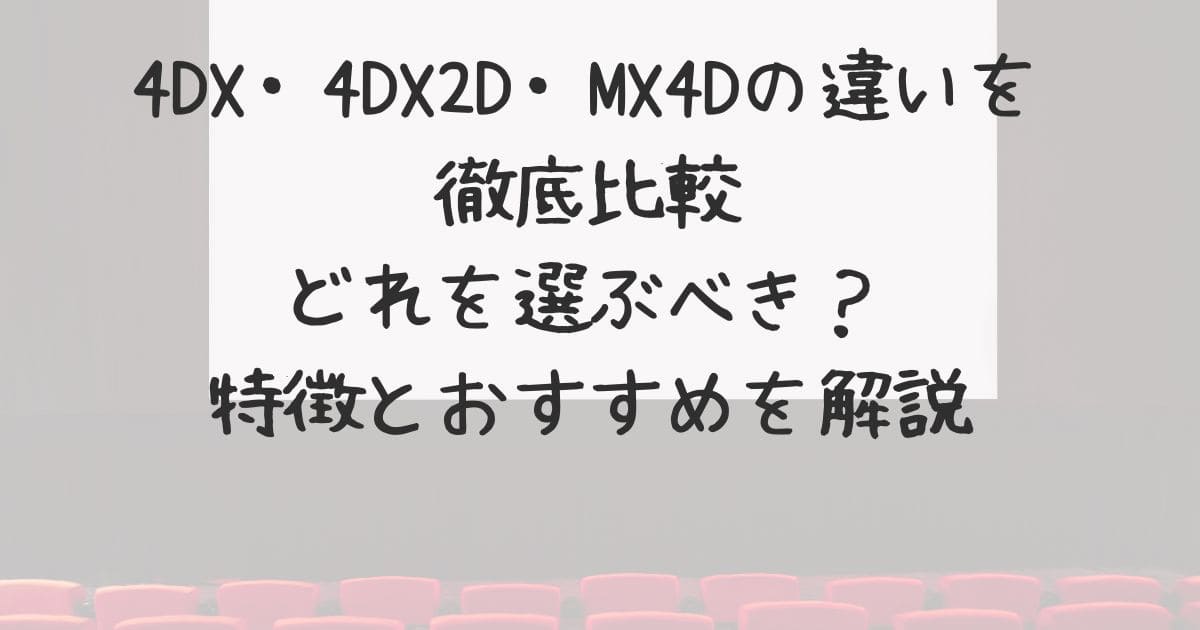 しかし、「4DXとMX4Dの違いは?」「4DX2Dってどんなもの?」と疑問を持つ方も多いはず。